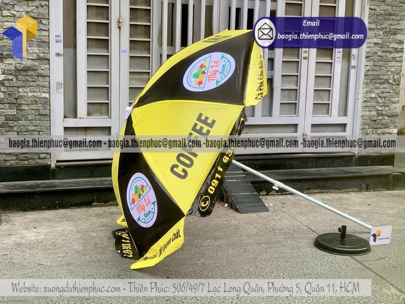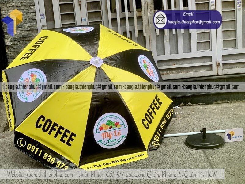 Đặt in dù tròn lớn quảng cáo ngoài trời cho quán cafe - Xưởng sản xuất & Công Ty Thiên Phúc chuyên cung cấp nhiều mẫu ô/dù quảng cáo tròn lớn che ngoài trời & thiết kế - in ấn logo với kích thước chủ yếu 2.2m hoặc 2.4m hoặc lớn hơn 3m.Với giá dao động rẻ nhất - cạnh tranh nhất thị trường chỉ riêng cây ô dù: 600.000đ - 800.000đ/cây; đế dù mua lẻ: 150.000đ/cái. Nếu mua đế cùng cây dù giảm còn 100.000đ/cái. Đặt số lượng lớn nhận ngay nhiều chiết khấu ưu đãi. Hỗ trợ xuất hóa đơn VAT đỏ cho doanh nghiệp & công ty. Liên hệ ngay xưởng Thiên Phúc nhận ngay báo giá nhanh chóng và tư vấn thiết kế logo. Giao hàng nhanh trên toàn quốc.
