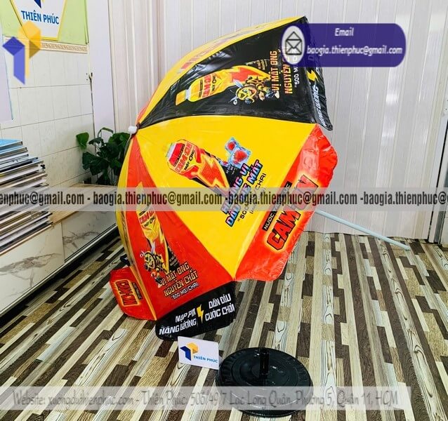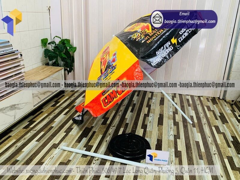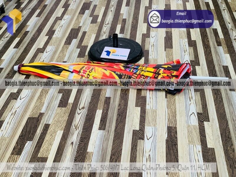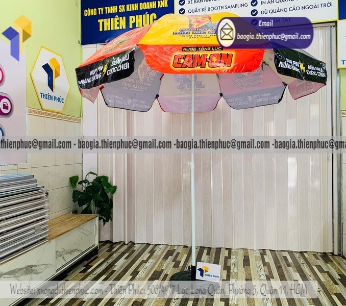 Đặt in logo dù quảng cáo sự kiện che ngoài trời độc quyền - Xưởng sản xuất & Công Ty Thiên Phúc chuyên cung cấp nhiều mẫu ô/dù quảng cáo tròn lớn che ngoài trời & thiết kế - in ấn logo với kích thước chủ yếu 2.2m hoặc 2.4m hoặc lớn hơn 3m.Với giá dao động rẻ nhất - cạnh tranh nhất thị trường chỉ riêng cây ô dù: 600.000đ - 800.000đ/cây; đế dù mua lẻ: 150.000đ/cái. Nếu mua đế cùng cây dù giảm còn 100.000đ/cái. Đặt số lượng lớn nhận ngay nhiều chiết khấu ưu đãi. Hỗ trợ xuất hóa đơn VAT đỏ cho doanh nghiệp & công ty. Liên hệ ngay xưởng Thiên Phúc nhận ngay báo giá nhanh chóng và tư vấn thiết kế logo. Giao hàng nhanh trên toàn quốc.