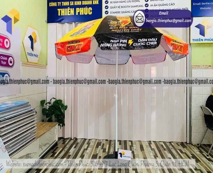 Tại xưởng sản xuất Thiên Phúc, chúng tôi luôn có nhiều mẫu dù quảng cáo sự kiện che ngoài trời độc quyền, được gia công và in logo theo yêu cầu, phù hợp với rất nhiều ngành nghề kinh doanh và mục đích sử dụng khác nhau. Dù quảng cáo không chỉ giúp che nắng, che mưa mà còn là công cụ quảng bá thương hiệu hiệu quả ngoài trời.