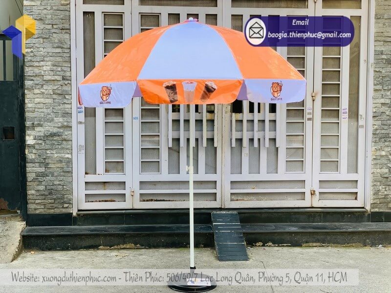 Dịch vụ in logo lên dù tròn quảng cáo cỡ lớn cho sự kiện - Thiên Phúc là xưởng sản xuất & Công Ty chuyên cung cấp & thiết kế - in ấn logo ô dù quảng cáo tròn cỡ lớn ngoài trời với kích thước chủ yếu 2.2m hoặc 2.4m với giá dao động riêng cây dù: 600.000đ - 800.000đ/cây; đế dù mua lẻ: 150.000đ/cái. Nếu mua đế cùng dù chung bộ giá chỉn còn 100.000đ/cái. Đặt số lượng lớn nhận ngay nhiều chiết khấu ưu đãi. Hỗ trợ xuất hóa đơn VAT đỏ cho doanh nghiệp&công ty. Liên hệ ngay Thiên Phúc nhận ngay báo giá nhanh chóng và tư vấn thiết kế logo. Giao hàng nhan trên toàn quốc.