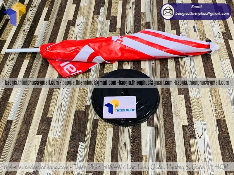 Mẫu dù tròn bạt quảng cáo in thương hiệu bền màu - Xưởng sản xuất & Công Ty Thiên Phúc chuyên cung cấp nhiều mẫu ô/dù quảng cáo tròn lớn che ngoài trời & thiết kế, in ấn logo thương hiệu với kích thước chủ yếu 2.2m đến 2.4m, 2.7m hoặc lớn hơn 3m.Với giá dao động rẻ nhất, cạnh tranh nhất thị trường chỉ riêng cây ô dù: 600.000đ - 800.000đ/cây; đế dù mua lẻ: 150.000đ/cái. Nếu mua đế cùng cây dù giảm còn 100.000đ/cái. Đặt số lượng lớn nhận ngay nhiều chiết khấu ưu đãi. Hỗ trợ xuất hóa đơn VAT đỏ cho doanh nghiệp & công ty. Liên hệ ngay xưởng Thiên Phúc nhận ngay báo giá nhanh chóng và tư vấn thiết kế logo. Giao hàng nhanh trên toàn quốc trong vòng 3-5 ngày tùy thuộc vào số lượng.