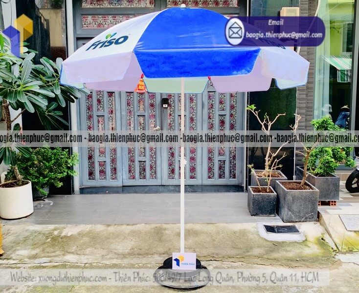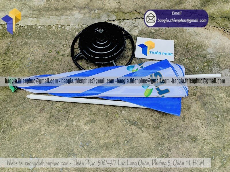 Nhận in ô dù tròn quảng cáo ngoài trời cho công ty - Xưởng sản xuất & Công Ty Thiên Phúc chuyên cung cấp nhiều mẫu ô/dù quảng cáo tròn lớn che ngoài trời & thiết kế - in ấn logo với kích thước chủ yếu 2.2m hoặc 2.4m hoặc lớn hơn 3m.Với giá dao động rẻ nhất - cạnh tranh nhất thị trường chỉ riêng cây ô dù: 600.000đ - 800.000đ/cây; đế dù mua lẻ: 150.000đ/cái. Nếu mua đế cùng cây dù giảm còn 100.000đ/cái. Đặt số lượng lớn nhận ngay nhiều chiết khấu ưu đãi. Hỗ trợ xuất hóa đơn VAT đỏ cho doanh nghiệp & công ty. Liên hệ ngay xưởng Thiên Phúc nhận ngay báo giá nhanh chóng và tư vấn thiết kế logo. Giao hàng nhanh trên toàn quốc.