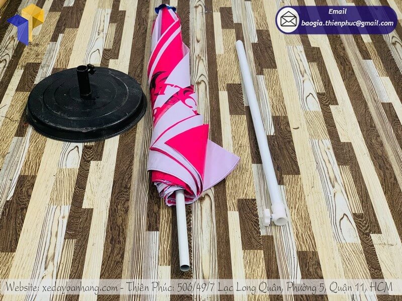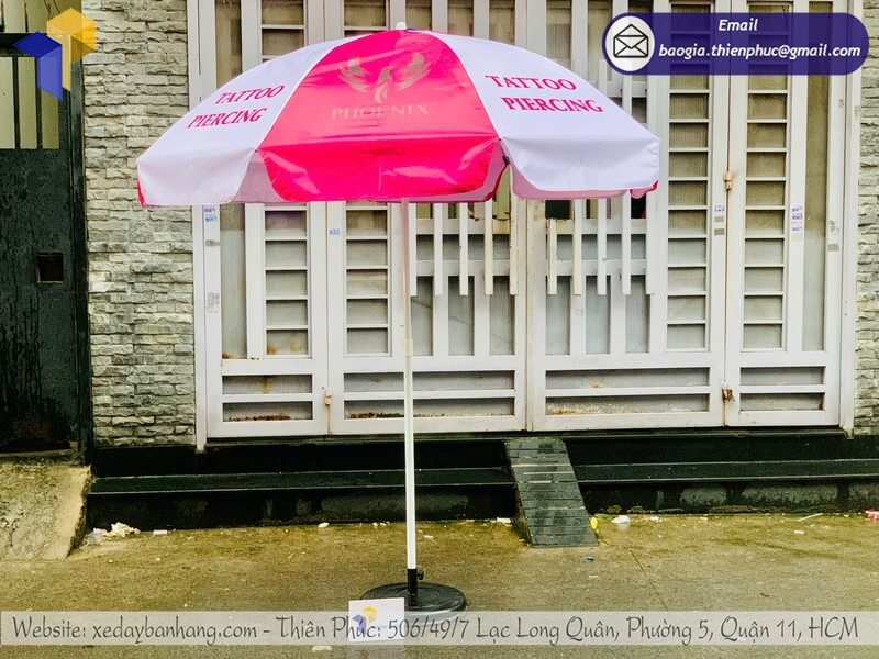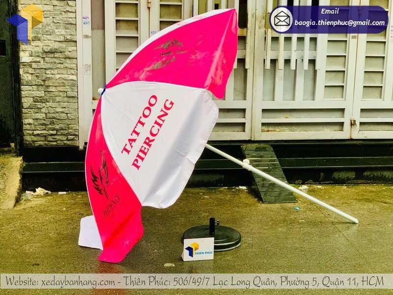 Xưởng in dù tròn che nắng ngoài trời thương hiệu - Thiên Phúc là xưởng sản xuất chuyên nhận thiết kế logo thương hiệu và in ấn. Nhận đặt đơn hàng số lượng lớn. Dao động rẻ nhất chỉ từ 600.000đ/cây - 800.000đ/cây trở lên (chưa tính giá đế dù: 150.000đ/cái khi mua mỗi đế, nếu mua đế + cây dù: 100.000đ/cái) Hỗ trợ thay áo dù: 220.000đ/cái. Liên hệ ngay với xưởng chúng tôi để được báo giá chi tiết.